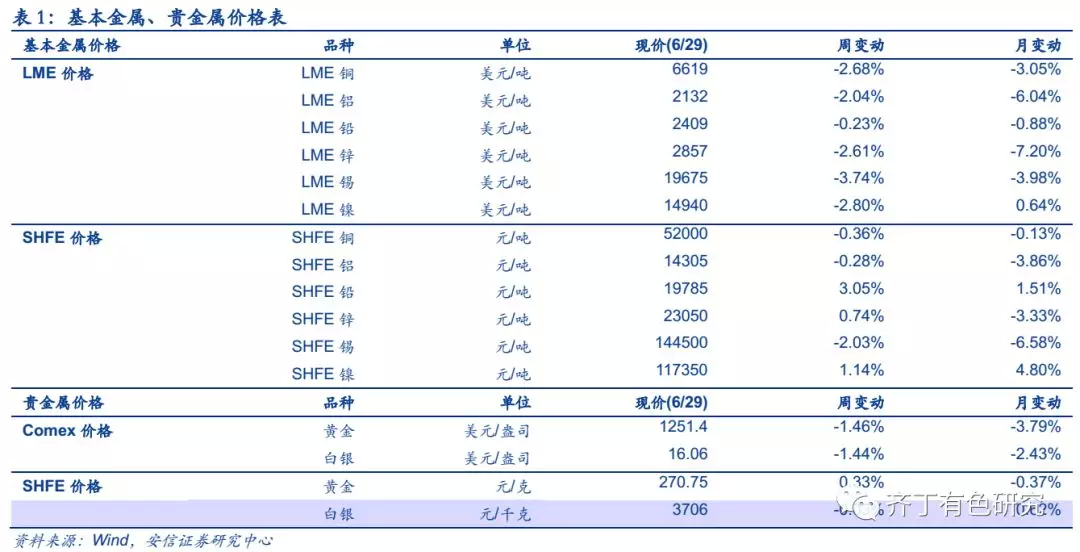 本周,根本金属连接回落,但不改有色Q3反弹逻辑主轴。本周LME铅、铝、锌、铜、镍、锡涨幅挨次为-0.23%、-2.04%、-2.61%、-2.68%、-2.80%、-3.74%。本周生意战对立连接升级,赓续打压经济拉长预期,压制商品和股市。邦内央行公告定向降准0.5个百分点,开释近7000亿的活动性;6月官方筑设业PMI录得51.5,高于上半年均值,总体连结扩张,咱们以为美邦与其他邦度相背离的钱银战略神情难认为继。本周CSPT三季度铜加工费聚会召开,同时智利铜矿薪资商量周期开启,众个铜矿发端拒绝薪资条约盘算举办罢工,铜供需紧平均式样希望延续。本周铝、镍库存连接消重,按照以往顺序,估计Q3铝将赓续去库,价钱重心希望上移。咱们仍看好有色Q3反弹,一是环球活动性绝望预期希望修复。二是地产发售数据向好叠加低库存特质希望鼓动投资上行,邦内经济整固企稳可期。三是战略层面,PPP项目清库影响近尾声,降准开启,钱银战略由紧转松希望慢慢开释资金生机。