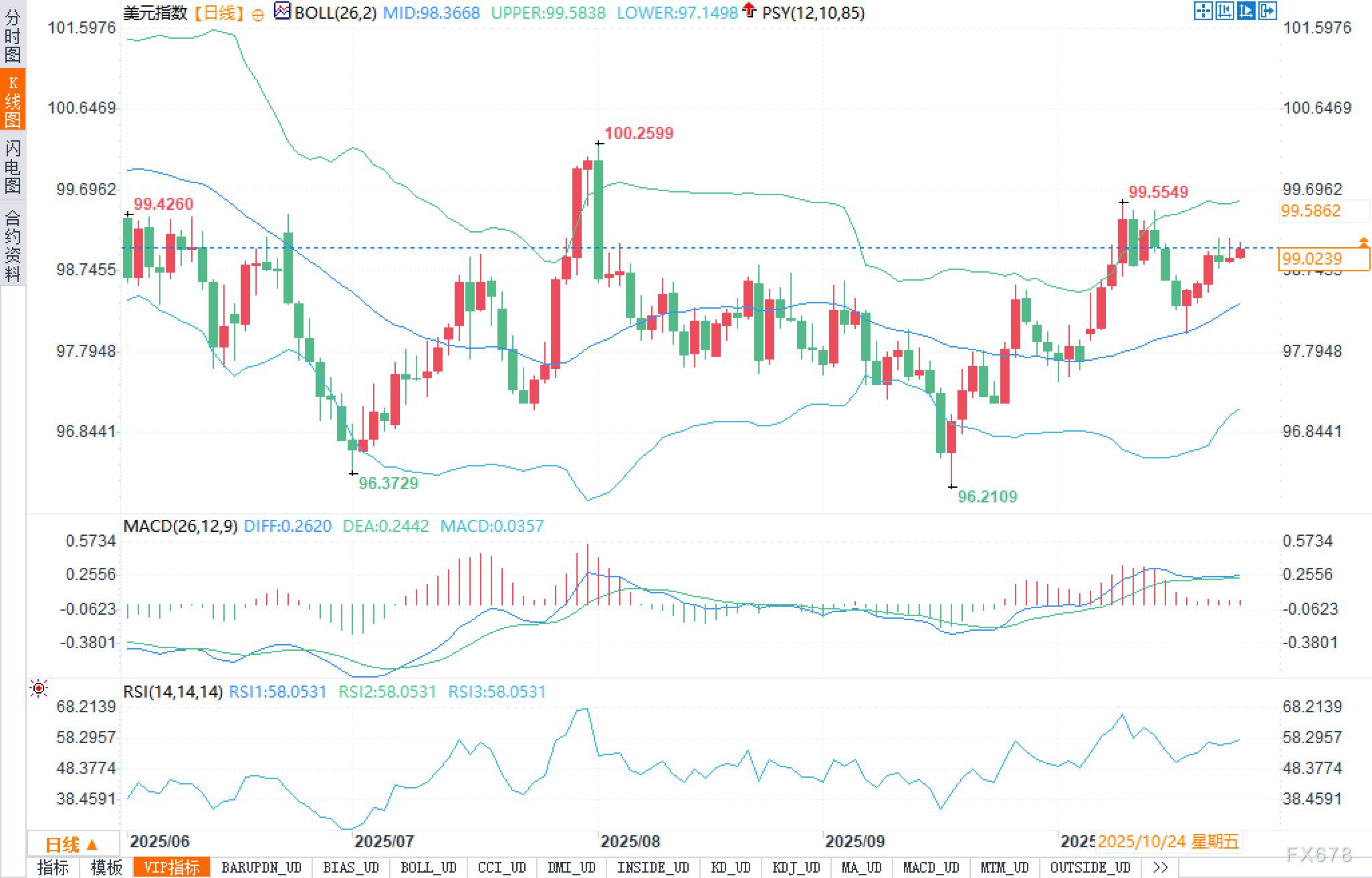 日线.43,处于中等水准。价钱现运转正在中轨与上轨之间,隔绝上轨约0.56、较中轨上方约0.66,呈“中轴上方的偏强盘整”。身手上要害锚点挨次为:高点100.2599,近期高点99.5549;低点96.3729与96.2109。