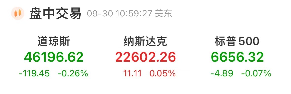 北京光阴9月30日晚,美邦政府停摆危机令美股承压,三大指数全体低开,截至发稿,道琼斯指数跌0.26%,标普500指数跌0.07%,纳斯达克归纳指数涨0.05%。