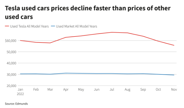 然而,今朝燃料价值慢慢走低、利率上升、特斯拉的产量增补,加上电动汽车行业比赛的加剧,导致二手特斯拉的价值降低速率疾于市集预期,并对特斯拉新车的价值发作了联动效应。
