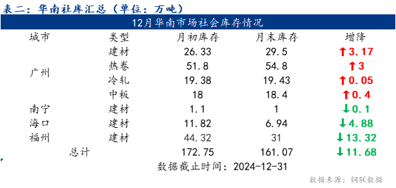 截止12月31日,华南地域要紧都邑钢材库存总量为161.07万吨,较月初裁减11.68万吨,跌幅为6.76%。数据显示11月份各要紧都邑钢材库存降幅月环比已渐放缓。