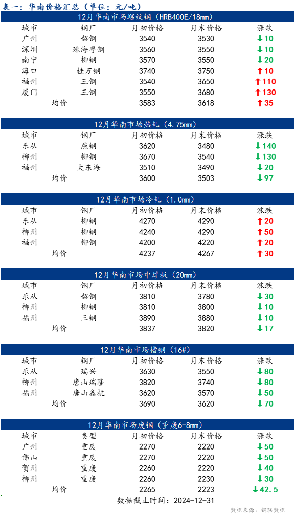 从外1数据显示,截止12月31日,华南地域要紧都邑螺纹钢均价正在3618元/吨,较月初均价上涨35元/吨,涨幅0.98%;华南地域要紧都邑热卷均价正在3503元/吨,较月初下跌97元/吨,跌幅2.69%;华南地域要紧都邑冷轧均价正在4267元/吨,较月初上涨30元/吨,涨幅0.71%;华南地域要紧都邑中厚板均价正在3820元/吨,较月初下跌17元/吨,跌幅0.43%;华南地域要紧都邑槽钢均价正在3620元/吨,较月初下跌70元/吨,跌幅1.90%;华南地域要紧都邑废钢采购均价正在2223元/吨,较月初下跌42.5元/吨,跌幅1.88%。