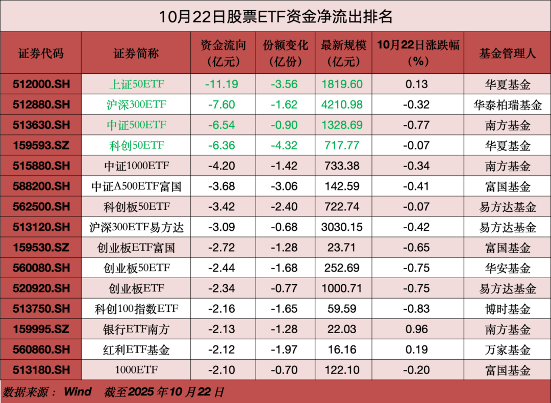 达2.61亿元;最新规模为225.98亿元2025/10/24中国股票交易所10月22日(本周三),A股三大指数全线收跌,截至收盘,沪指跌0.07%,深成指跌0.62%,创业板指跌0.79%。正在商场动摇调度之时,股票ETF个人资金“跑了”。