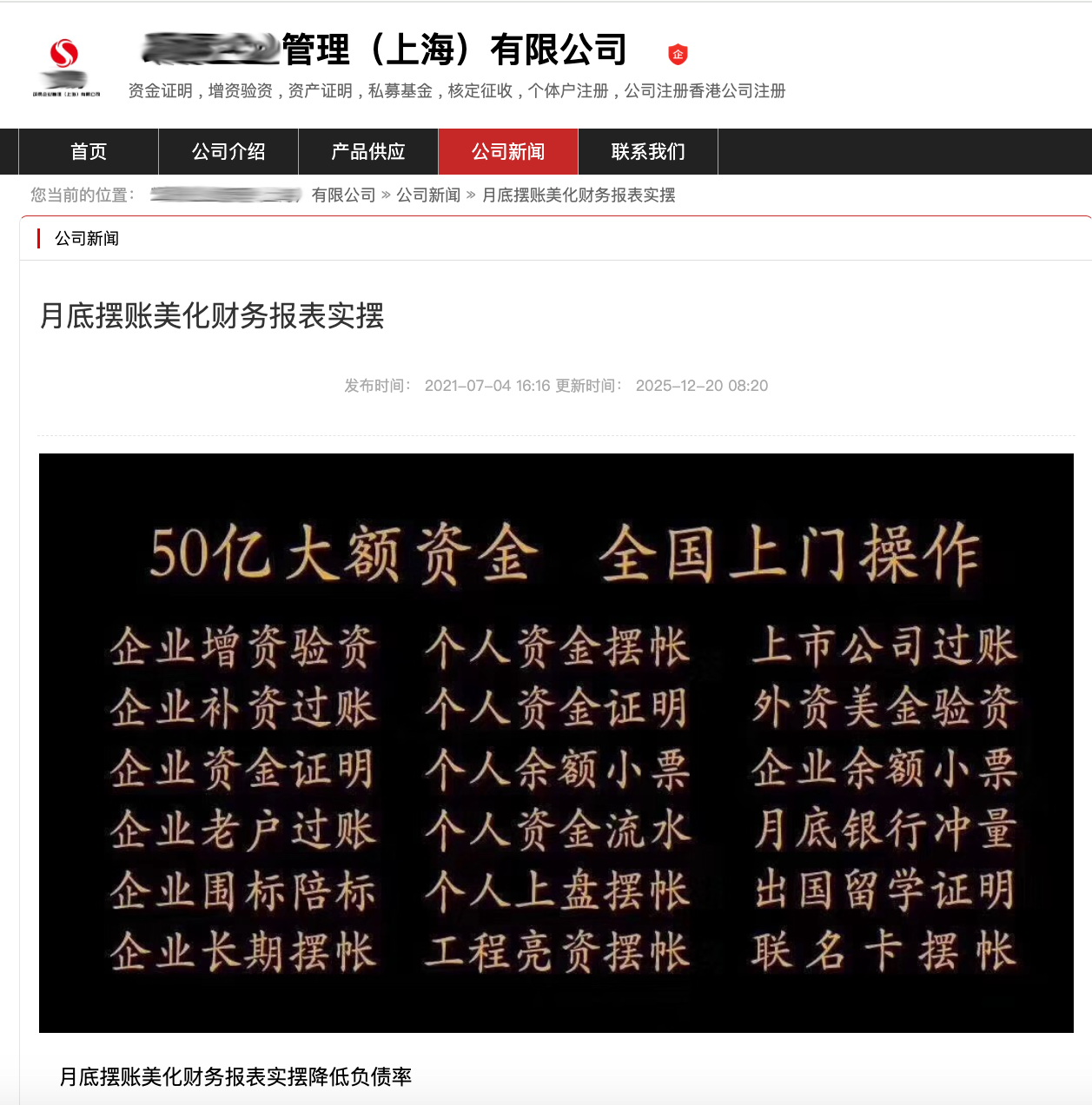 其它,记者正在百度上寻求“摆账财报美化”,一家名为“某某企业束缚(上海)有限公司”也正在其网页上陈设“月底摆账、美化财政、实摆、低重欠债率”等生意。记者通过网站上留下的电话号码加了对方微信,对方了了必要企业供给征信申报和“道途”,资金于2025年12月31日汇入,2026年1月4日转出,用度是1.9%。通过比对网站和“天眼查”所收录的该机构音信,二者高度相仿。