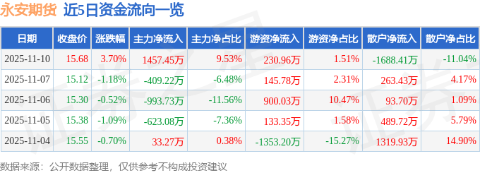 散户资金净流出1688.41万元?期货mt4软件下载证券之星动静,截至2025年11月10日收盘,永安期货(600927)报收于15.68元,上涨3.7%,换手率0.68%,成交量9.87万手,成交额1.53亿元。