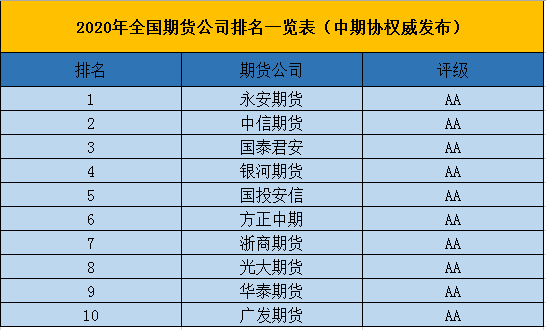 期货公司每年城市有排名,让咱们看看2020年寰宇期货排名前十的公司吧。排名从第一名到第十名,挨次是永安期货、中信期货、邦泰君安、银河期货、邦投安信、正直中期、浙商期货、光大期货、华泰期货、广发期货。可能看到前十名都是AA级期货公司,值得信托。