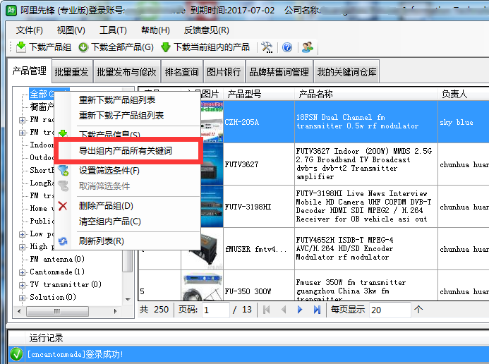 批量更调掌握人,转移分组上下架,删除阿里后台产物,导出题目和环节词,及时显示产物数据。