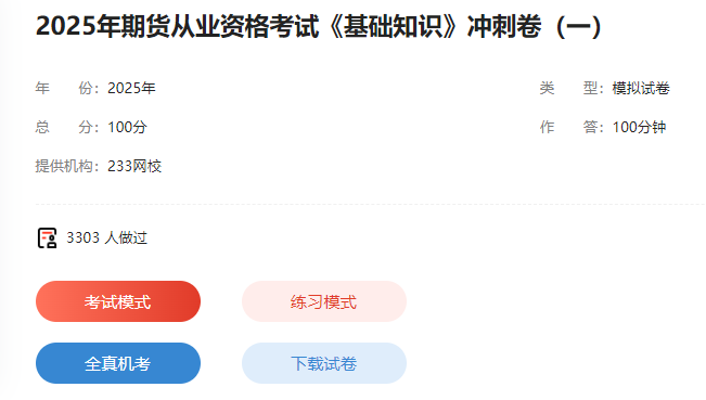 233网校APP可免费刷期货章节习题、积年真题、模仿试题、逐日一练、模考大赛、答题闯合,通过刷题,加深加强,左右重点,查漏补缺,稳步晋升!【进入下载APP刷题】