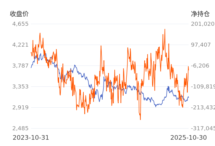 据统计,近两年价钱和净持仓数据的相干系数为0.21,两者存正在弱正相干合联(同向性)。