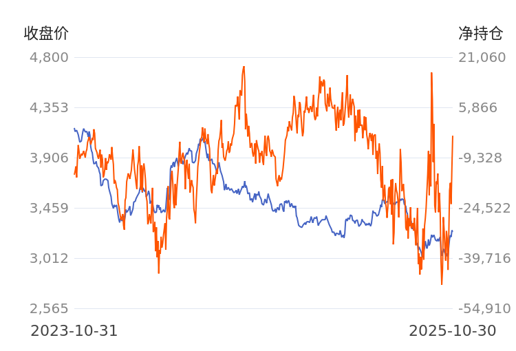 据统计,近两年代价和净持仓数据的相干系数为0.10,两者存正在弱正相干相干(同向性)。