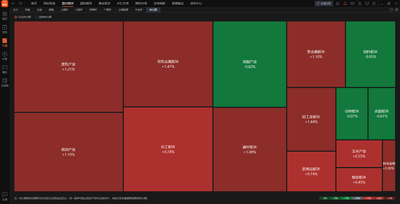 新增热力争功用,助助查看行业及种类热力争。热力争板块面积与浸淀资金数额成正比,浸淀资金数额越大,则对应板块的面积越大。板块颜色与对应的涨跌幅合联,涨跌幅度越大,则对应板块的颜色越深,详细颜色与涨跌幅的对应联系可通过热力争右下角的颜色标尺查看。