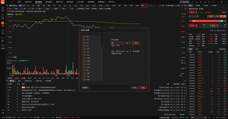 PC端新增自界说周期功用,助助对邦内期货周期实行自界说筑立。您可正在期货详情页的周期选项中单击“更众”,鄙人拉列外中点击“自界说”按钮进入自界说周期筑立弹窗筑立您须要的K线周期。