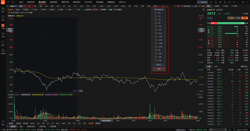 邦内期货新增tick行情和秒级K线行情。您可正在期货详情页的周期选项中点击“tick”按钮查看tick行情,点击“更众”按钮采用和查看5秒、10秒、15秒、30秒K线行情。