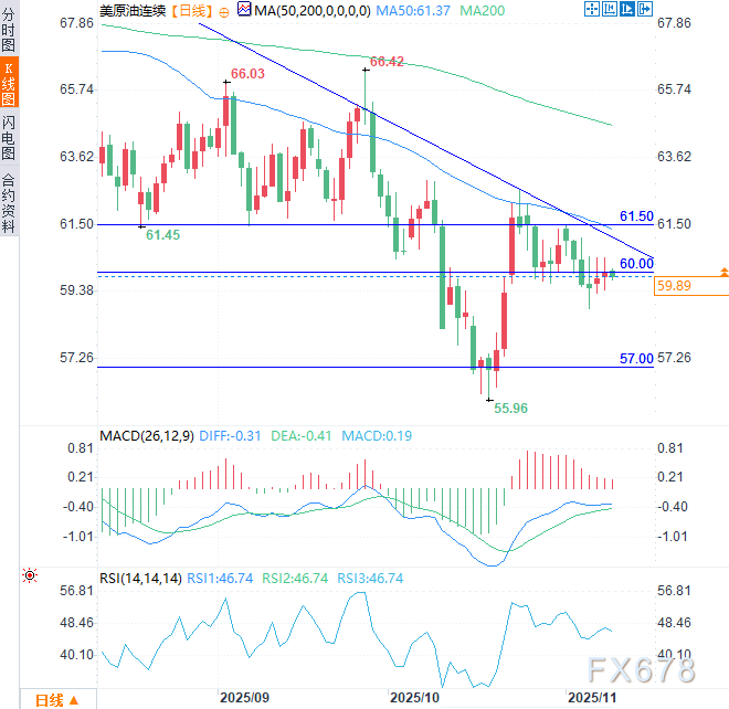 中石油价今日价格表明过去14个交易日的平均动量呈现中性偏空走向汇通财经APP讯——周二(11月11日)美原油贯串小幅走低约0.42%至59.88美元/桶相近,并未延续前两个来往日涨势。过去两周中,油价振动幅度永远小于3%,反应出近期市集赓续仍旧平静的中性偏空态势。对潜正在供应过剩的忧郁令短期市集心绪耽搁未必,只消OPEC+产量计谋未开释显然信号,这种偏向性缺失很恐怕接续控制油价走势,使将来数日油价维护正在中性区间内振动。
