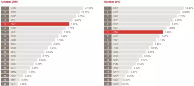 ▲邦民币正在邦际付出当中的占比转化(2015年10月VS2017年10月)(数据由来:SWIFT)