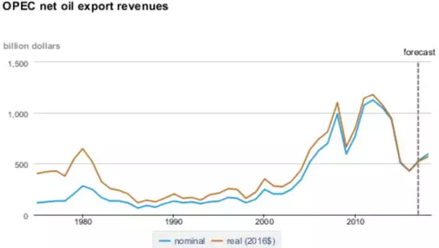 ▲欧佩克石油出口净收入(左轴,单元10亿美元)(数据由来:美邦能源新闻局)