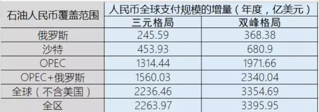 假设环球石油出口邦(除美外洋)广博给与石油邦民币,则正在“三元格式”和“双峰格式”下,邦民币环球付出的年度领域估计分散增添2236.5亿美元和3354.7亿美元。