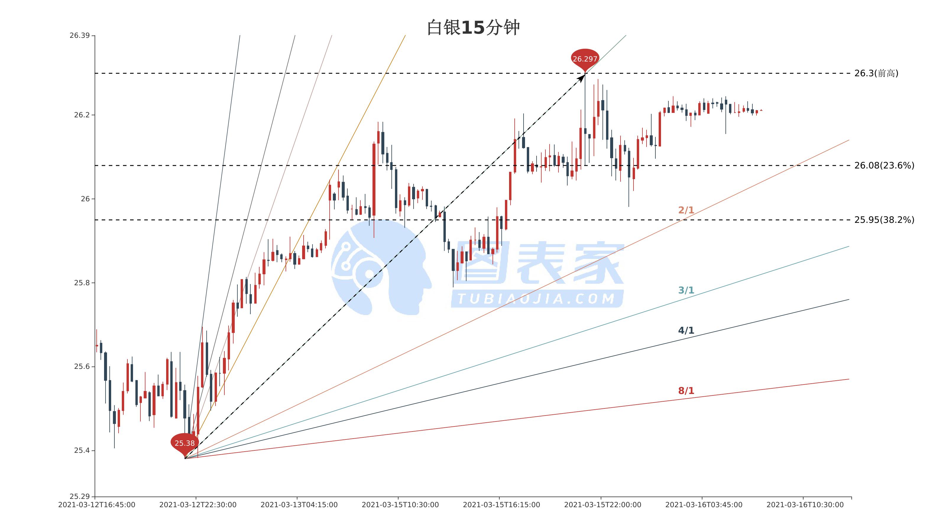 500)this.width=500 align=center hspace=10 vspace=10 alt=图为白银15分钟走势图,价值短线下方,若价值络续下行,短线维持,跌破后盘中需合切2/1甘氏线,后市或将进一步看跌至斐波那契38.2%回调位25.95。