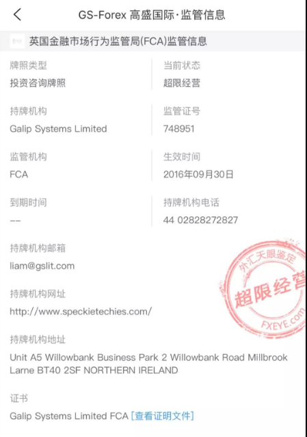 经盘查,GS-Forex高盛邦际持有的英邦(FCA)拘押执照为投资斟酌类执照,其执照天禀没有从事外汇经纪生意的权限,属于超限度策划,存正在强大危机。