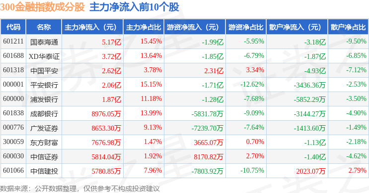资金流向方面,300金融(399914)指数成份股当日主力资金净流入合计2.69亿元,逛资资金净流出合计6.59亿元,散户资金净流入合计3.9亿元。成份股资金流向详情睹下外: