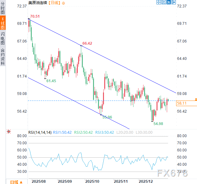上行方面,下行通道上轨60美元仍组成明显阻力,有用打破该点位后,大概逆转短期看跌目标;下行方面,55美元组成初阶维持。